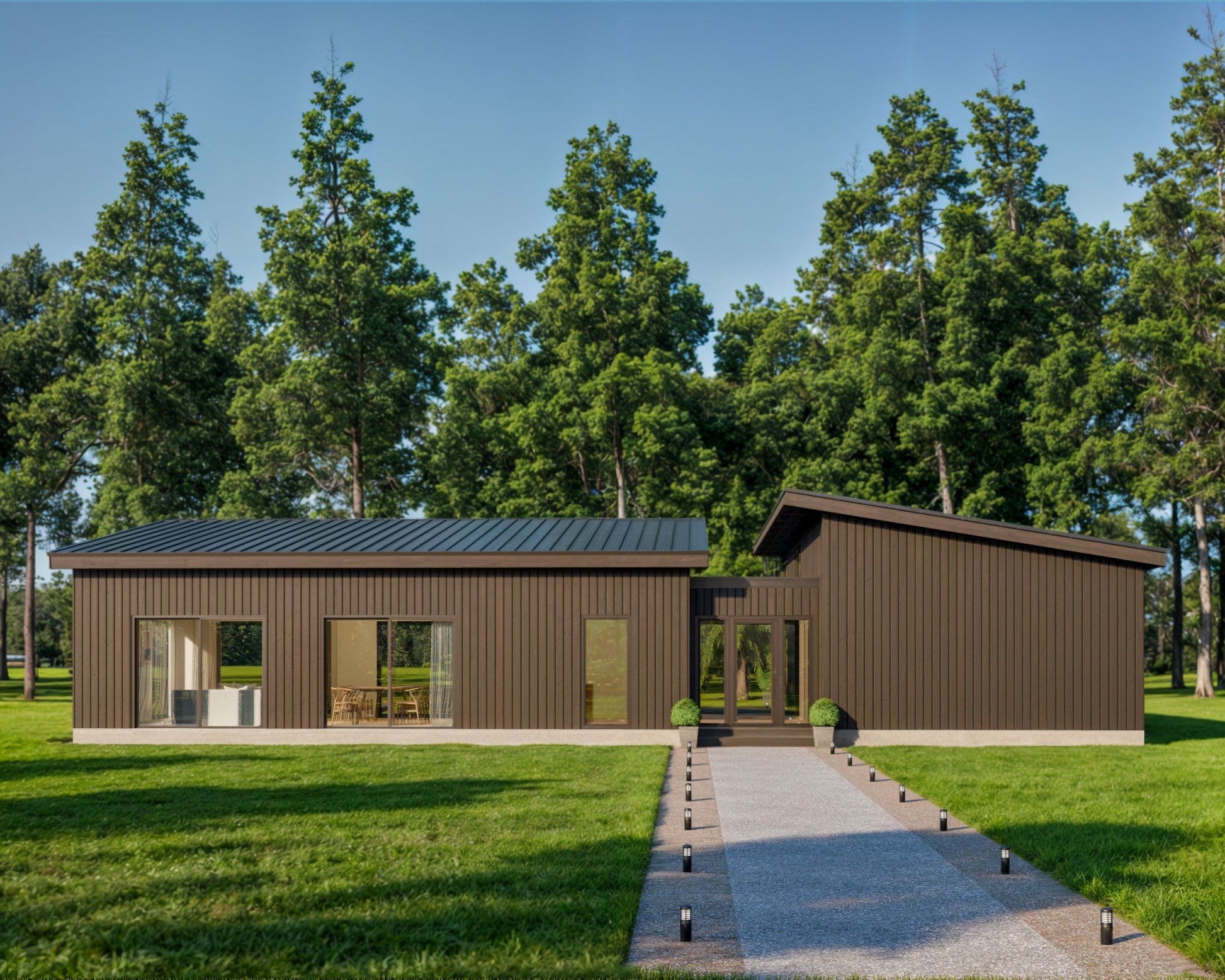 This shed roof L-shaped cabin house plan features 3 bedrooms, 2 bathrooms, and a modern open floor layout. Designed with large windows, high ceilings, and wide sliding glass doors, it offers a bright and spacious interior with stunning outdoor views.